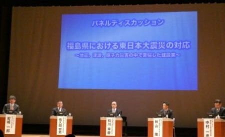 一般財団法人3・11伝承ロード推進機構が、地域防災力の向上や被災地の交流促進を目的に開かれ、今回、福島県及び福島県建設業協会の共催により実施されました。約200名が参加。基調講演は、矢澤県土木部長が「東日本大震災、原子力災害からの復興」の内容で講演を行いました。パネル討論では、県内建設会社の代表者ら5名が参加、弊社の石川幸慶専務執行役もパネリストとして登壇し、地震や津波、原子力災害を乗り越え、インフラ復旧や被災者の捜索など当時を振り返る内容の討論会でありました。